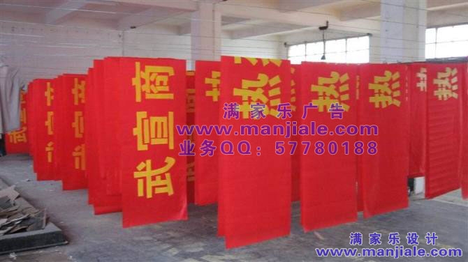 深圳滿家樂專業生產制作各種條幅、橫幅、旗幟熱轉印旗、雕印旗、導游旗、旅游旗、公司形象旗,各國國旗,彩旗,仿古旗,桌旗,串旗,錦旗,授帶,衣服印字。可根據客戶來樣訂做各種款式的旗幟,有近十年的生產制作經驗,我們有專業的設計人員和生產技術人員 ,經過多年的努力,使我們的產品質量與款式均處于行業領先水平。